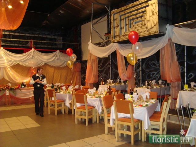 У меня почти все свадьбы - цветочно-драпировочные. Есть, конечно, красивые места - рестораны с хорошим интерьером - такие заведения украшать - только портить:rolleyes: ... а иногда в такое место привезут, так думаешь: здесь и взрыв не поможет:eek: Вот одна из последних свадеб - сельский клуб такой - для совсем гопоты, наверное, чуть ли не ресторан пришлось сделать... Фото помещаю в таком порядке - "до" и "после", чтобы было понятно - где что "выросло": |