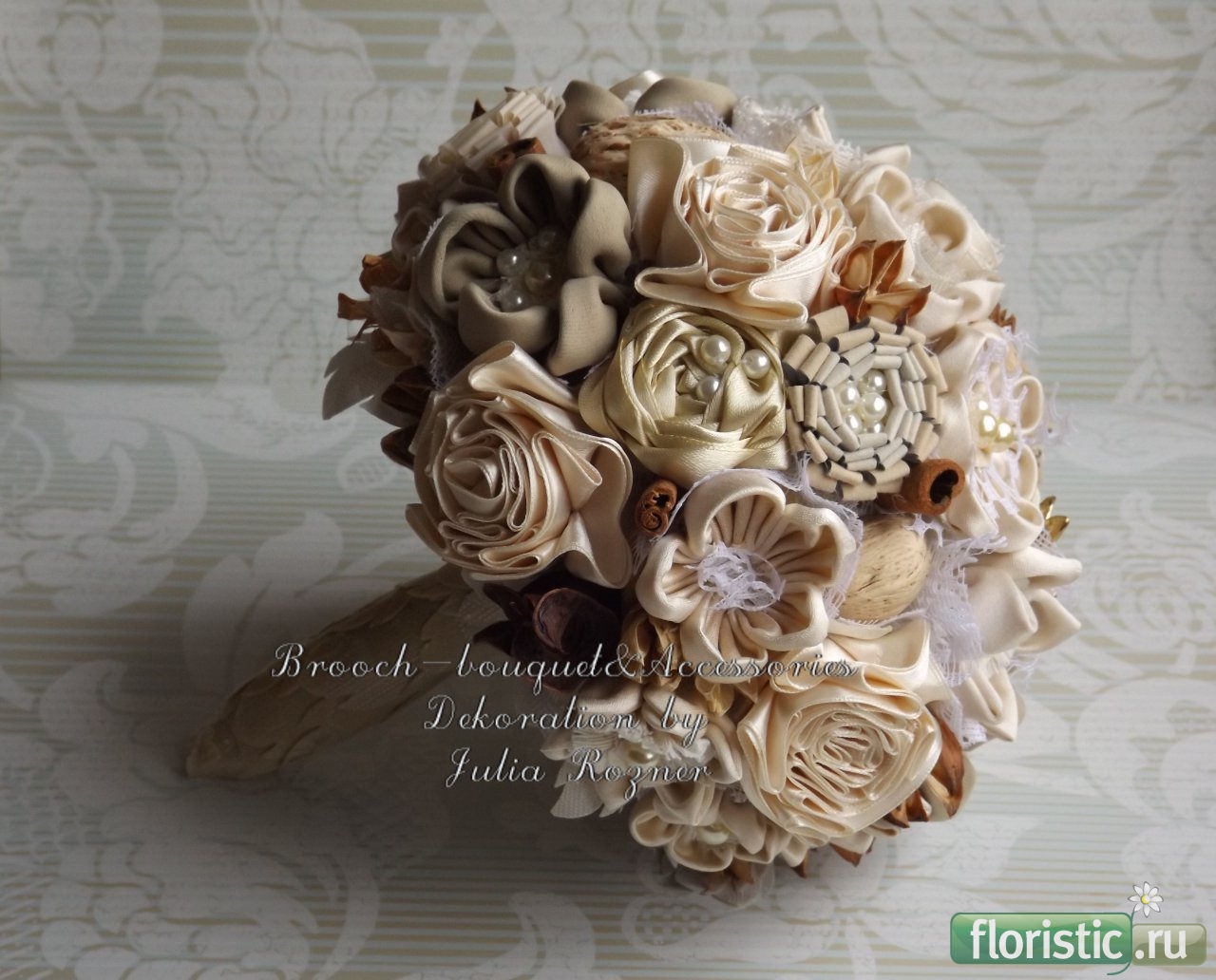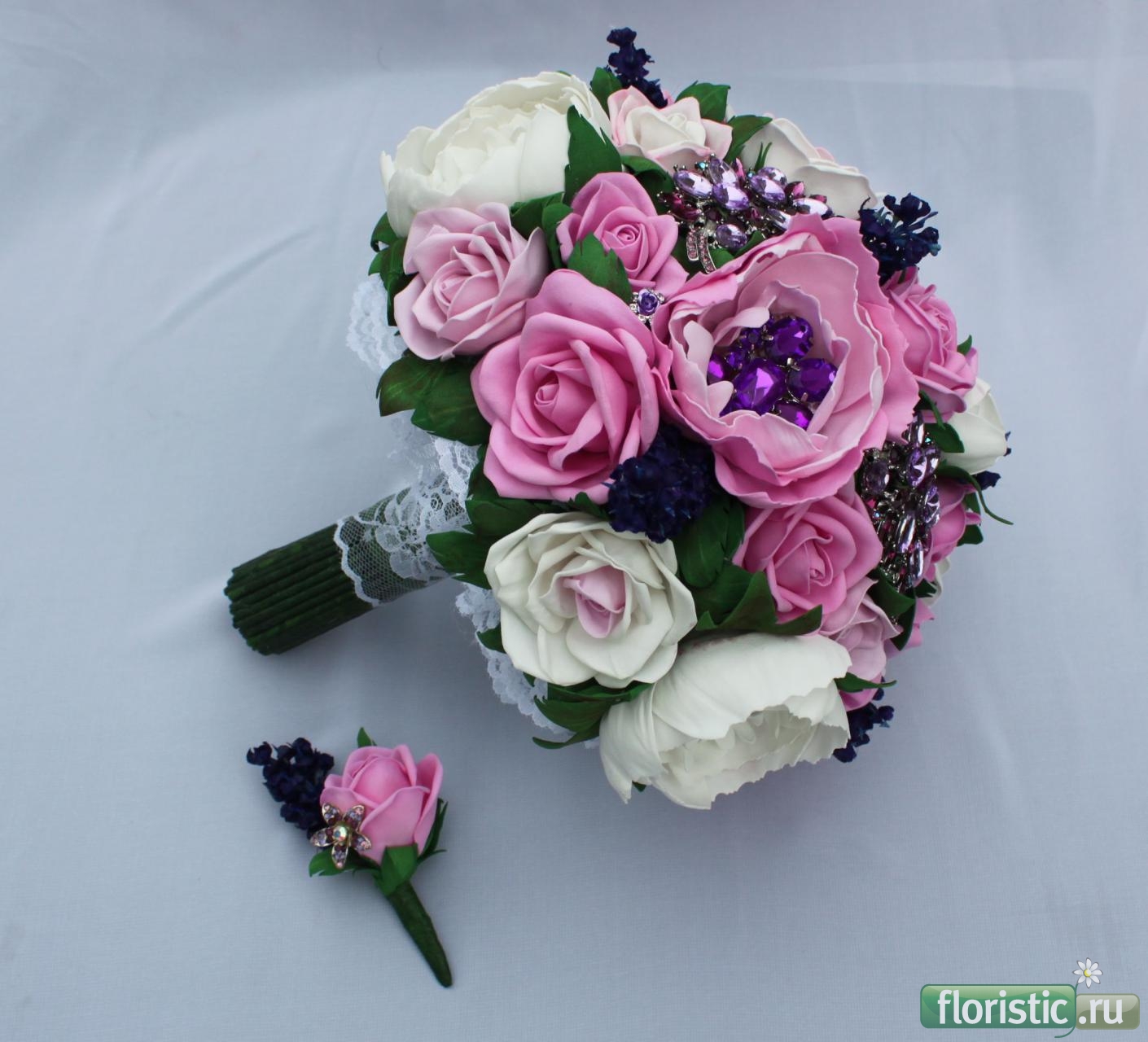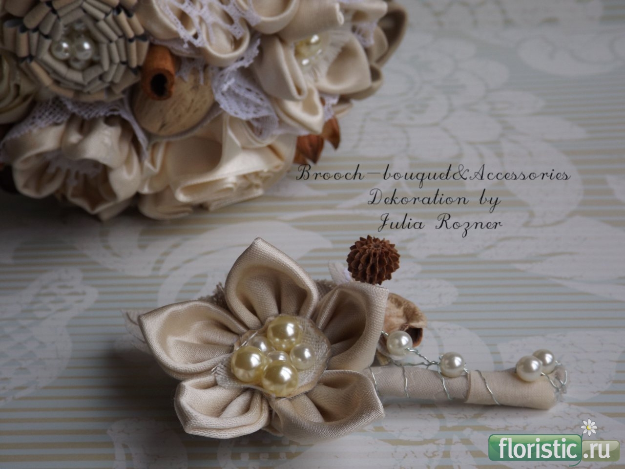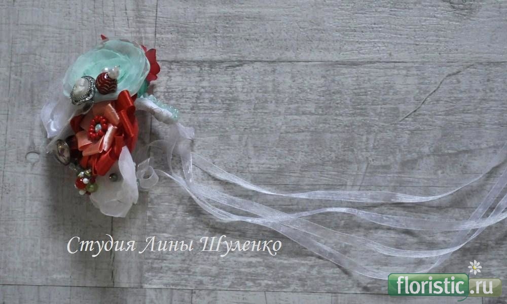 Случился и у меня подобный заказ. Свадьба была тематическая,в духе 50-60-х годов,невеста захотела именно такой декоративный букет. Часть материалов предоставила сама: камеи,броши,кулоны,заколки. Ряд аксессуаров, в том числе и цветы,делала уже я. Бутоньерки делались в цвет костюмов и галстуков.