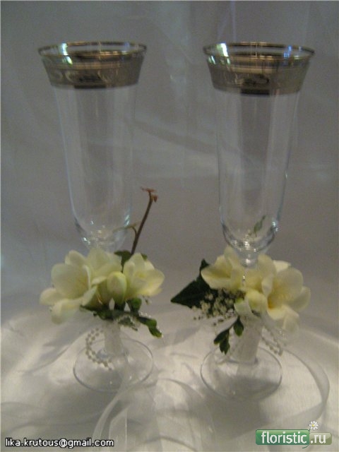 Лика,мне кажется,что Вы сильно заглубили фаленопсис,вверху мне все нравится,а по бокам получились дырки.Хотя общего плана букета я не вижу,может я и ошибаюсь.А бокалы получились хорошо,нежно очень смотрятся.