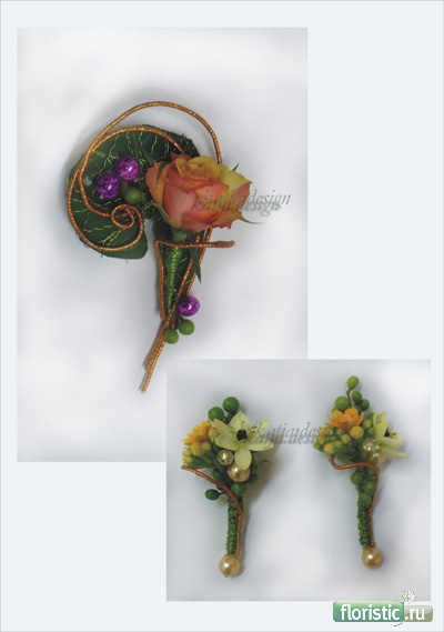 p@ddy, Вы все правильно поняли - это альтернатива ,привычной глазу, бутоньерке...А свидетельнице я предлагаю выбрать для себя не бутоньерку, а браслет, если это гармонирует с ее нарядом.. Вот еще несколько вариантов моих альтернативных бутоньерок. На втором фото - бутоньерка для жениха и свидетелей.. |