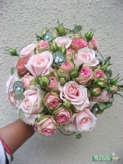 Мне наконец -то заказали букетик из гвоздики, правда пришлось некоторое время уговаривать. Отправила кучу фото с букетами из гвоздик. Слава Богу невеста согласилась. Изначально она хотела маленький букетик из розовых роз и много фаленопсисов. На ее фото были достаточно крупные орхидеи по кругу и розы слоями. Невеста хотела , что бы орхидеи были видны со всех строн. К сожалению сейчас по всем магазинам фаленопсисы с 2-3 расцвевшими цветками и слишком крупными ,а бюджет небольшой, потому пришлось купить 2 горшка и растягивать орхидеи, в неболшой нахлест смотрелось бы лучше(на мой взгляд). Это был день улыбки- вот большую счастливую смеющуюся во весь рот улыбку я и выложила. Вот такой розовый смайлик. ![]() ![]() Остальные фото в моем блоге Оказалось совсем не просто сложить ровный шарик, лепестки внутри цветка короче чем по краям. Букет в монтажной технике. Внутри цветы на своих ногах, по внешнему кругу тейпированный на проволке. Орхидеи тейпированные с мокрой ваткой и приклены флористическим клеем. Можно было что-то с зеленью по-лучше придумать, но у меня что-то никак не придумывалось и не получалось красиво выложить. Я не волшебник, я только учусь! УРРРРААА!!! Нашла где учиться!!!! |