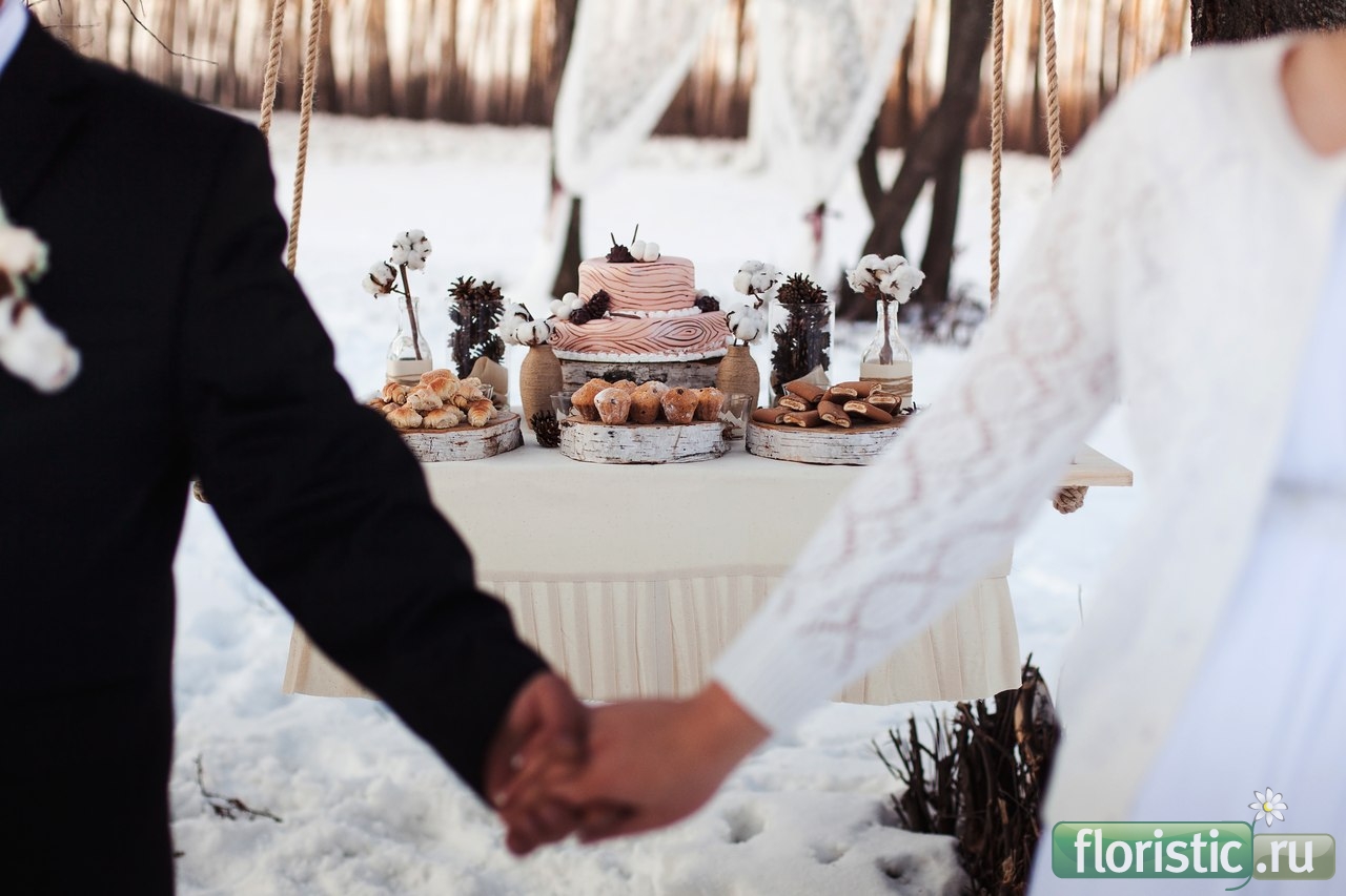 Под аркой поставили спилы дерева один на другой , на него круглое стекло и "ручку" для подписи. Невесте вместо букета делала муфточку с белыми розами и гирляндами из гиацинтов, украшение в прическу с розами и серебристым аспарагусом.