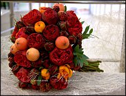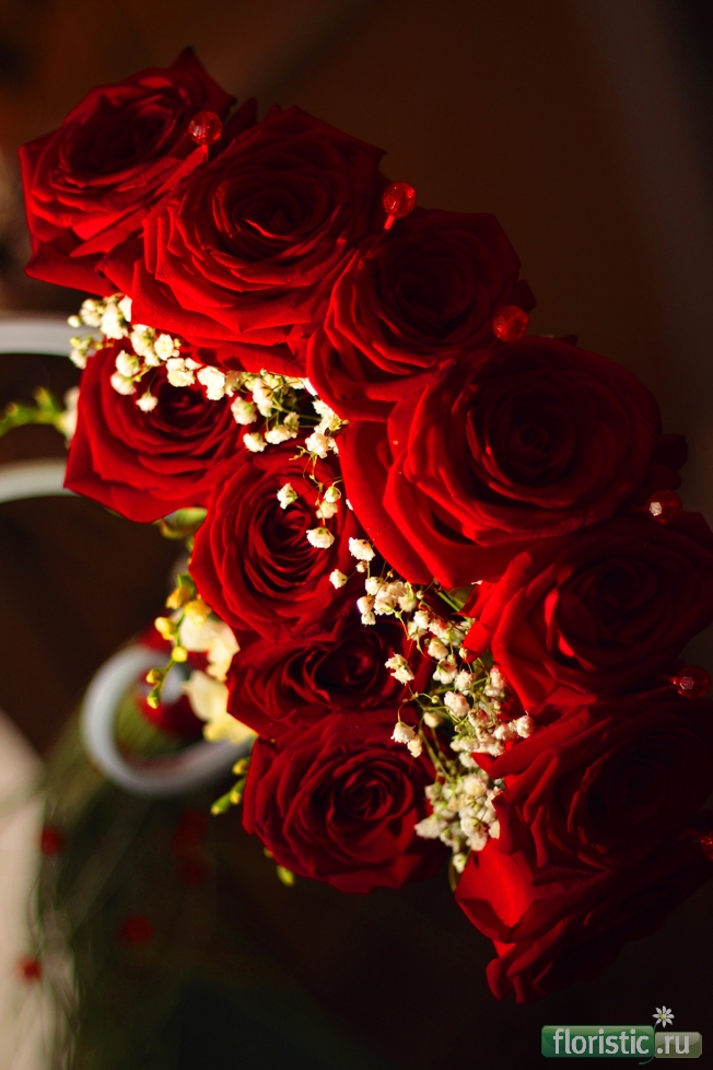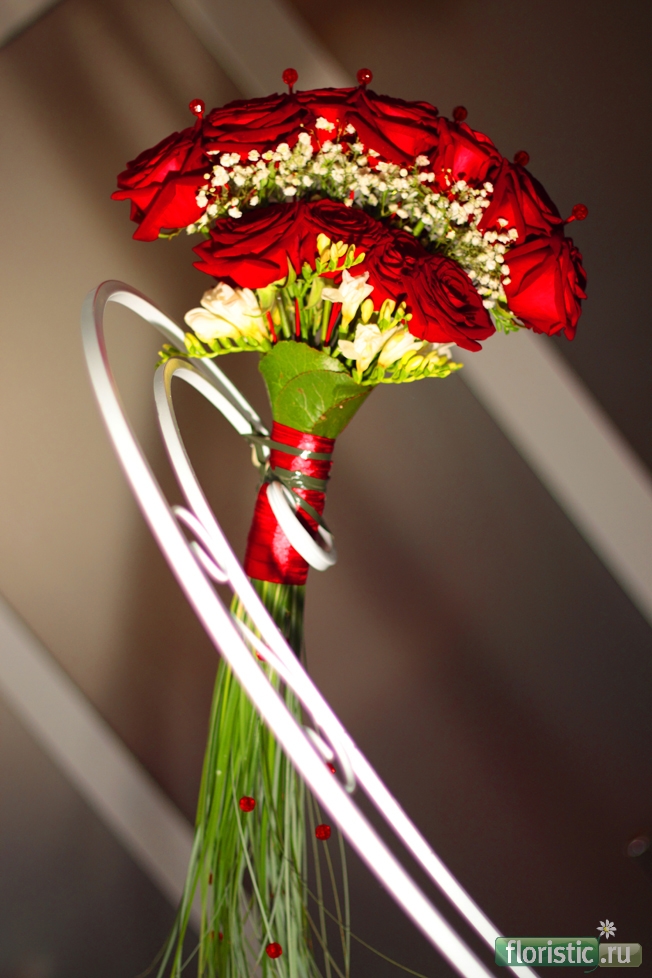Там простой проволочный каркас, прикрытый гипсофилой. Заказ принимала не я, я немного легче бы его предложила сделать, но и в этом варианте невесте очень понравилось - у них что-то испанское было на свадьбе, красная роза в волосах невесты, красная роза на лацкане у жениха и такой вот букет-веер с хвостом. В последний момент добавила над розами бусинки, а когда жених пришел за букетом, увидела, что у него один в один такие же пуговки на рубахе. Хотелось бы фото с невестой, но я не частный флорист - работаю в магазине, не могу придумать способ заинтересовать невест приносить (скидывать) фото - если вдруг у кого есть такой положительный опыт - поделитесь,плиз))