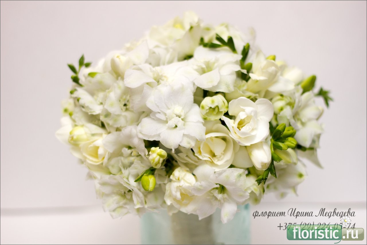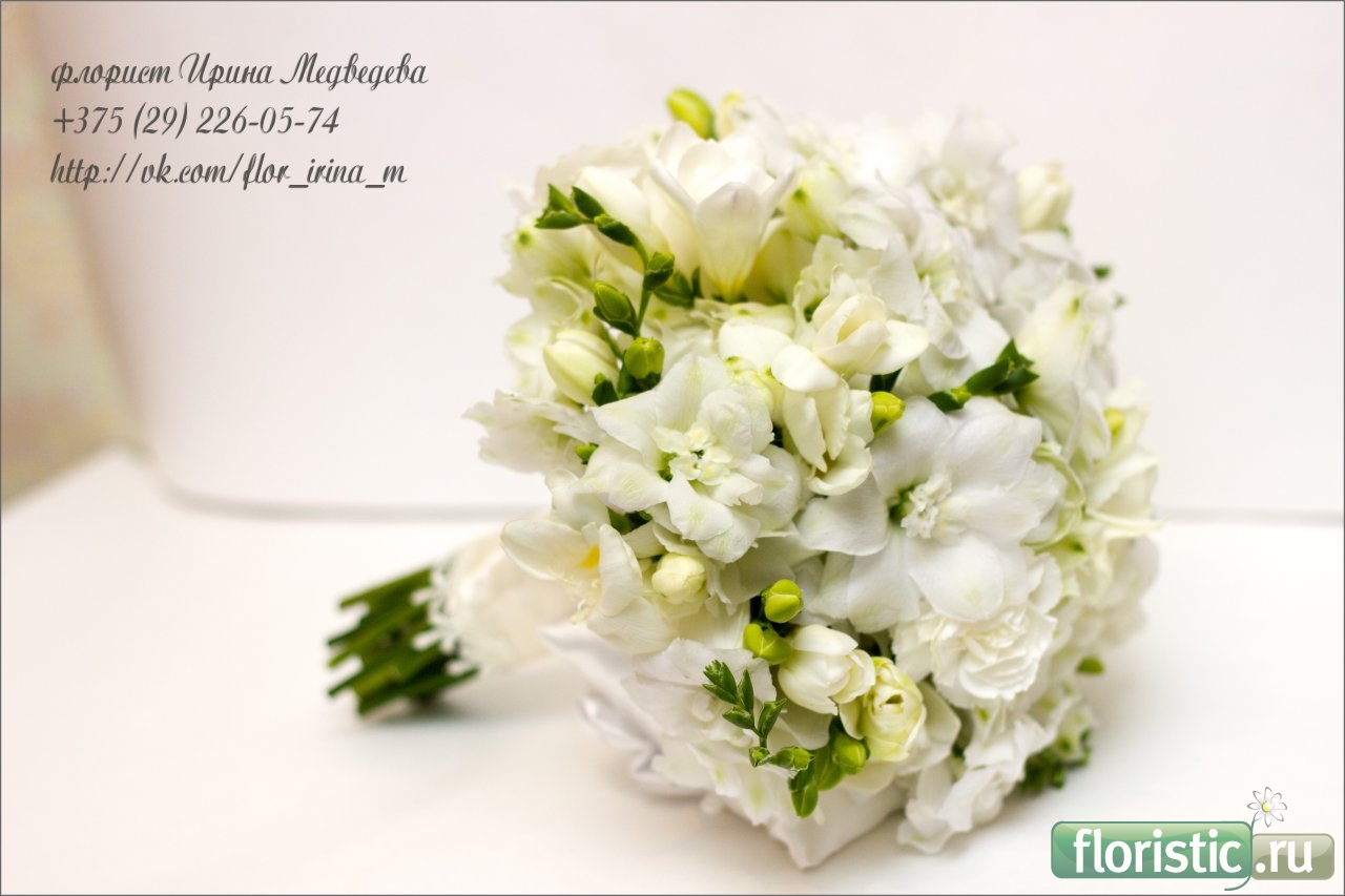 Хотела выложить свои фото в тему "руками непрофессионала", но потом даже растерялась. Я никогда нигде не училась, да и толком не работала флористом нигде. Началось как хобби, а сейчас доп.заработок в декрете. но 1-2 букета в неделю у меня есть стабильно. Правда все они стандартные, простенькие. Но тут хочу показать свой последний, фрезия и дельфиниум. Я с дельфиниумом первый раз работала, и то потому что эустому не привезли и заменить было нечем... Букет на ложных ножках. Буду рада критике |