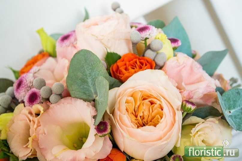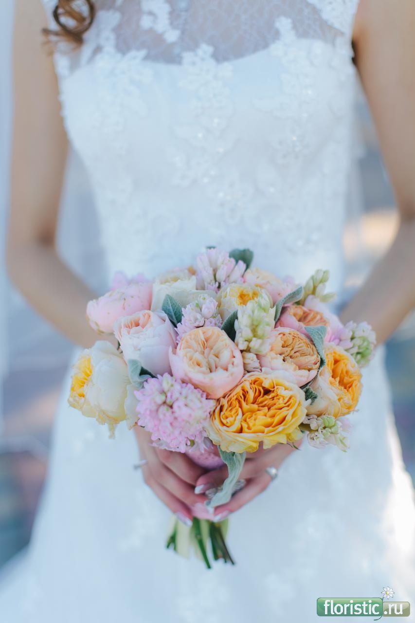 Были и классические белые, кремовые варианты. Но и встречались яркие, смелые по цвету. Один букет был из карамельных и розовых роз, роз капучино. |