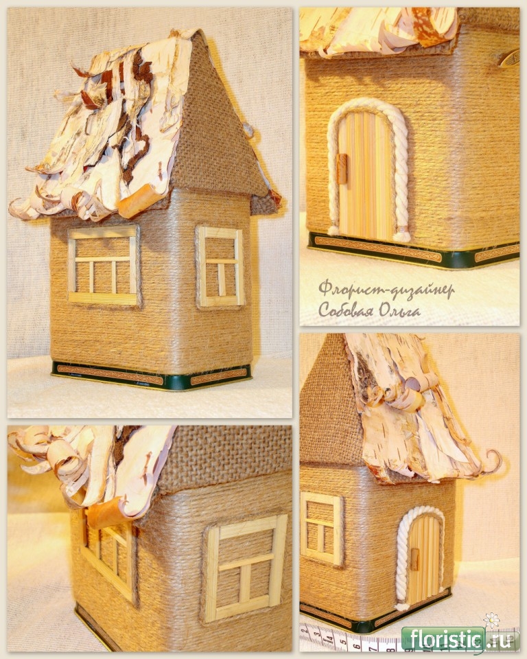 А вы потом эти переделки использовали в букетах как дополнение? Очень красиво. А можно по подробнее из чего делали домики. Технику я понял а вот материал не как не пойму какой? Крыша из картона я прав?