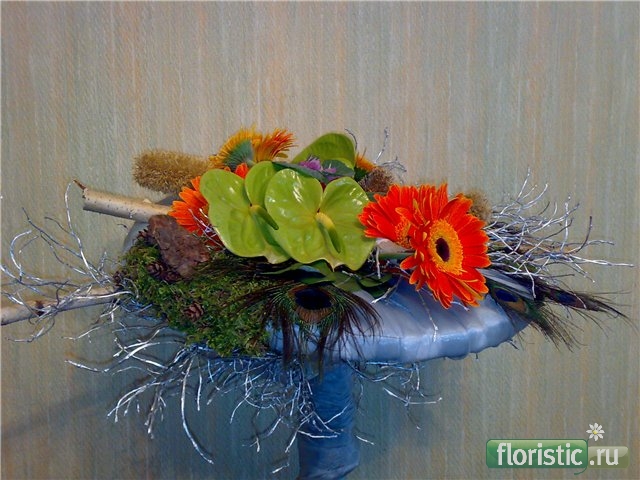 Не могу назвать себя супер профессионалом-флористом, но замечу как дизайнер - ассоциативный ряд в декоре нарушен, я имею ввиду мох, шишки, береста, а перья-экзоты к чему?