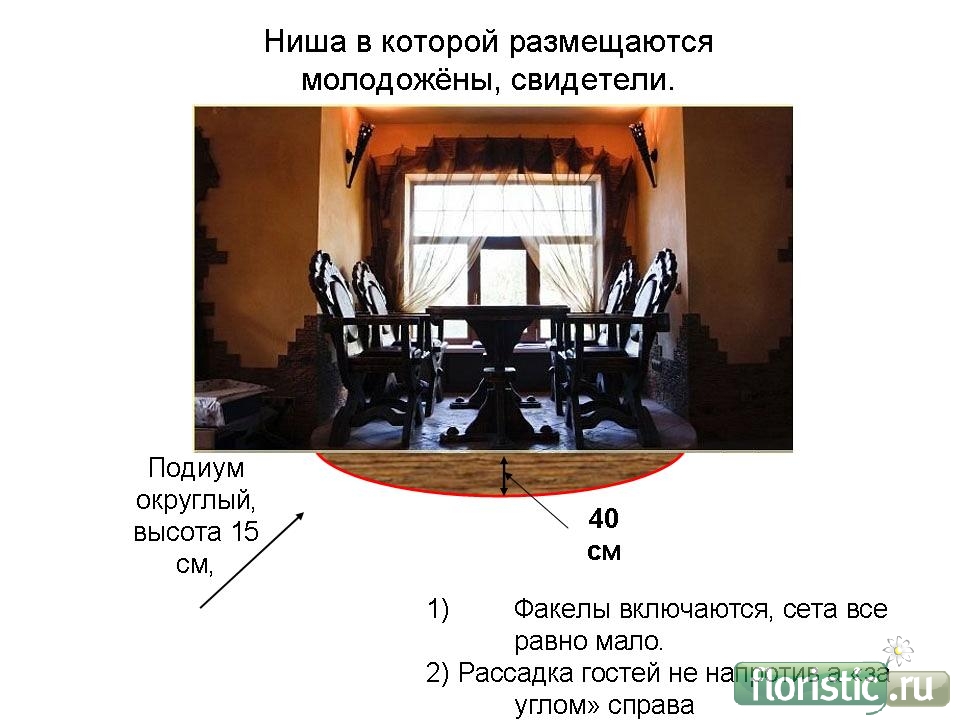 Архитектура сложновата для классического оформления, но её тяжесть нужно облегчить гирляндами из цветов и зелени,я бы закрыла окно в нише с молодаженами шелком и растянула над ними цветочную гирлянду,цветочные украшения должны быть "легкими".если мало света,то надо включить в композиции свечи,это еще и романтики придаст.я работала в подобном интерьере,но к сожалению сохранились только фото новогоднего оформления