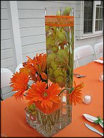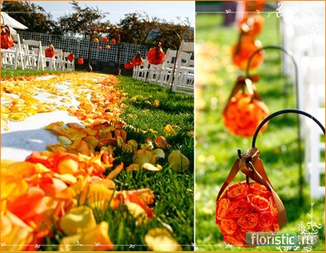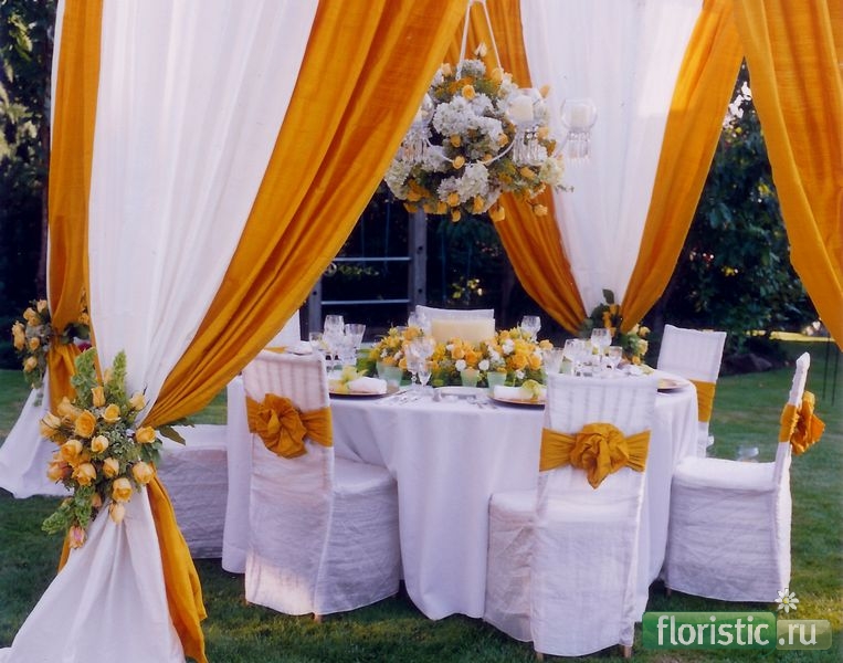 Предполагаемые материалы - гербера, роза,......... Декор - лента атласная, ткань (вуаль, шифон), желательно светлые тона....... 1. Входная группа - небольшие ампельные композиции под фонарями (зелень, цветы, ленты...). Или - напольные композиции на стойках или вазах по обе стороны (возле кабанчиков). 2. Зал - можно задействовать балки на потолке (ткань, ленты...). Под факелами всего зала - ампельные цветочные композиции. На гостевой стол возможно композиции со свечами. 3. Зона молодожёнов - драпировка тканью ниши (по периметру), возможно иллюминация (электрогирлянда под ткань). Композиция на стол. 4. Обязательны светлые скатерти и чехлы на стулья! Зал будет выглядеть гораздо светлее и наряднее. Плюс банты оранжевого цвета. 5. Барная зона - драпировка тканью, ленты, композиции или гирлянда на стойку - или сверху (навес), или внизу (стол). Удачи!!! Фото-инет.