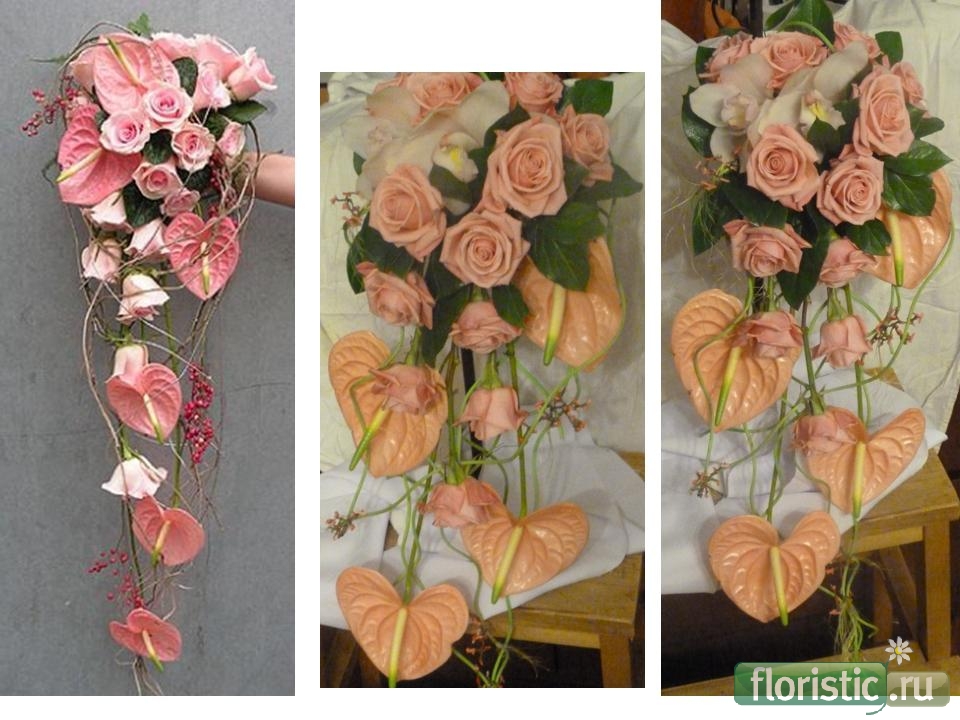 Сделала букет. Не хватило мне антуриума, сделали мне замену в заказе, еле-еле нашла розовый, но количество - только 4 листа! А надо было 2 раза больше. Не знала как выкрутиться... Вот что получилось. Мне кажется то у меня есть ошибки... но какие - не понимаю... слева - макет... |
