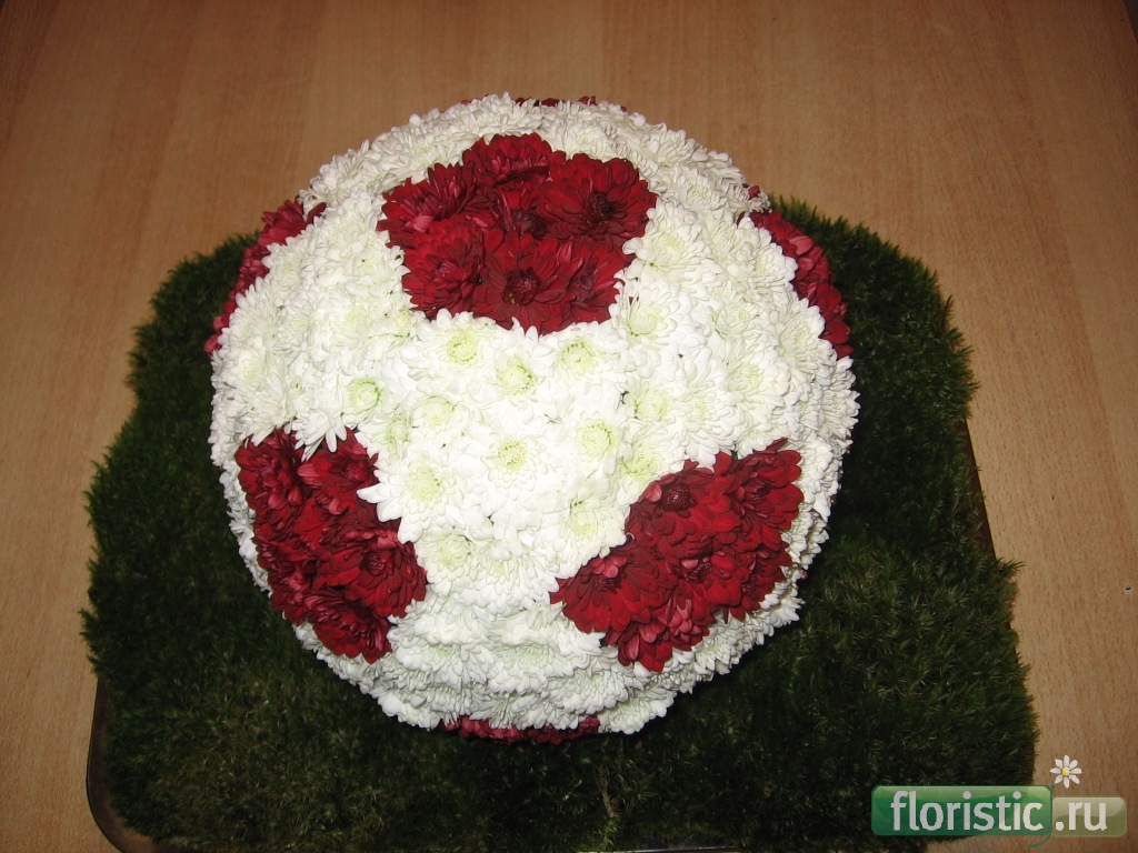 Непентас, вот такой футбольный мяч в натуральную величину получился у меня (диаметр = 22 см, оазис - шар, поле - лесной мох, основа - металлический поднос). И что-бы мячик "не укатился", оазис насажен на пластмассовый штырь.