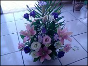 ничего нелепого. самокритика- это, конечно, хорошо, но в разумных пределах. во всех ваших работах совсем не видно задуманной вами формы композиции. в данном случае самое основное- это вразброс и треугольником стоящие лилии. попробуйте поставить их чуть ниже и, например, 2 рядом и 1 отдельно. и 2 верхних темных лизиантуса ближе к центру, иначе получается форма лопаты.