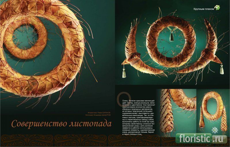 СОВЕРШЕНСТВО ЛИСТОПАДА (Флористика Баранов Роман, Фотограф Владимир Ададуров) Осень, богатая красками меняющей цвет листвы, всегда роскошна, великолепна и царственна. Она приносит неисчислимое количество разнообразных природных материалов, из которых творческий потенциал художника может «выплавить» удивительные композиции. Так, из кленовых листьев, трансформированных и переплетенных между собой, выполнены работы в стиле ар-нуво, которому свойственны сложные геометрические узоры. Для усиления эффекта в работах использованы кожаные элементы, художественная ковка, декоративная тесьма, бархат и перья степных птиц. Создать такие сложные и объемные композиции можно, только если необходимый природный материал имеется в достаточном количестве. Поэтому автор выбрал в качестве основы для своих работ листья клена остролистного. Листья аккуратно сворачивались у основания, затем послойно укладывались друг на друга в «римской технике». Между собой и к сложному каркасу листья крепились при помощи технических скоб. Особую роль в работах сыграли черешки листьев, придавшие объектам легкость и динамику Галерея «осенних» работ Романа Баранова, выполненных с чувством стиля и несомненным мастерством, сможет облагородить и внести эстетику более высокого уровня в современный интерьер. А возможно даже заставит посмотреть на дизайн помещения новым взглядом и кардинально изменит его. http://www.floristic.ru/forum/pictur...pictureid=1679 http://www.floristic.ru/forum/pictur...pictureid=1677 http://www.floristic.ru/forum/pictur...pictureid=1678 |