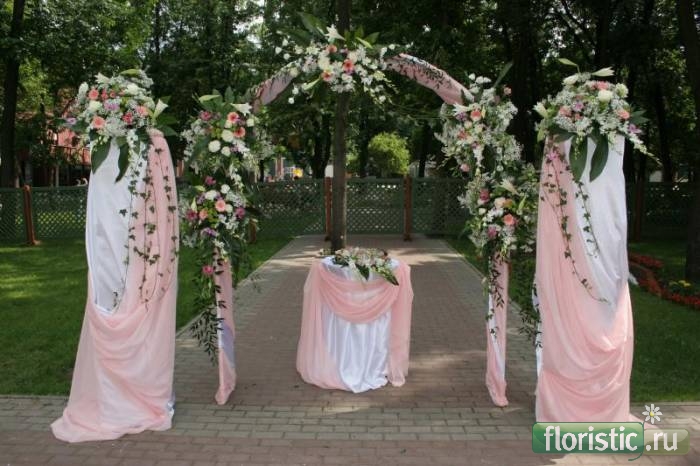 У меня заказали арку с драпировкой, без цветов. Хотели сначала с цветами, но я назначила за неё цену 8, кажется, тысяч (это было 3 года назад) За арку с тканью я поставила цену пять. Не представляю, сколько девушка сэкономила, но вот что она получила в итоге: |