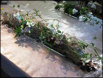 .Вот эти конусы, например - строительная сетка, в которую аккуратно вплетены довольно большие съемные пластковые емкости, потом это все обмазывается смесью ПВА с гипсом, потом оклеивается бумагой, потом опять клеевой состав, в который для фактуры добавлена то ли сухая солома, то ли еще какой "супчик", потом все это сушится и красится-колорируется в любимый цвет (ваш или заказчика). Основа под прозрачные шланги - старые замшелые ветки. Все крепится шурупами, гвоздями или связывается декоративной проволокой. Для получения нужного изгиба внутрь шланга вставляется стальная довольно жесткая проволока... Потом остается добавить воды, поставить совсем немного цветов и украсить лианой - пасифлора - палочка-выручалочка. Выглядит результат примерно так: |